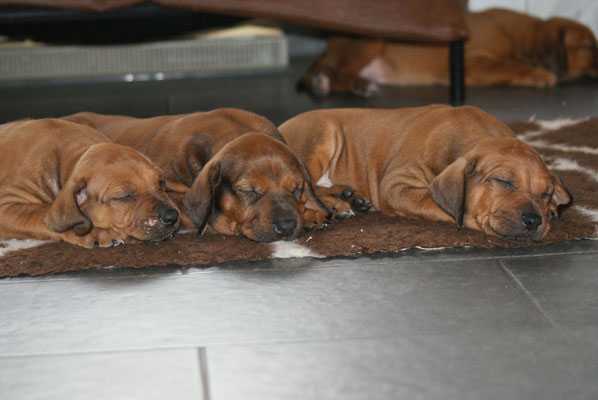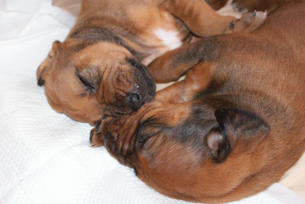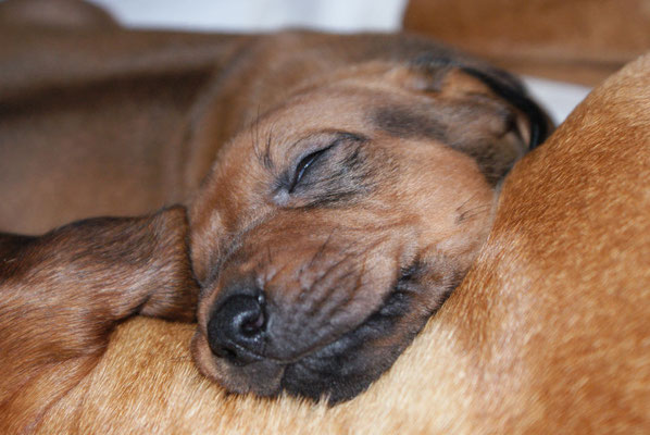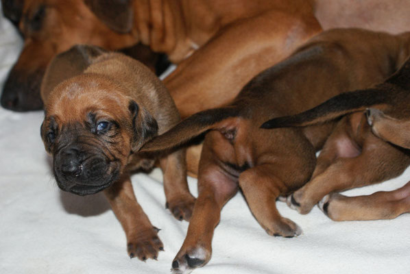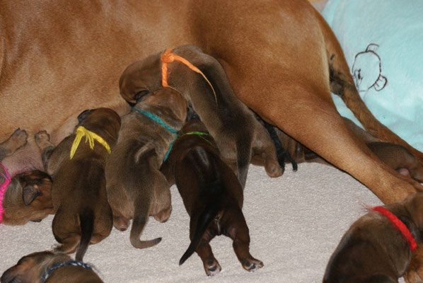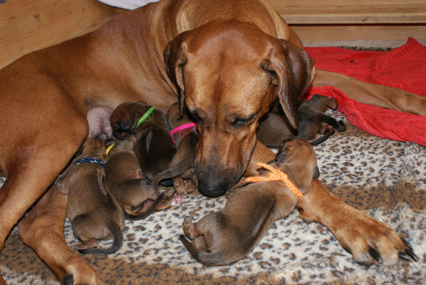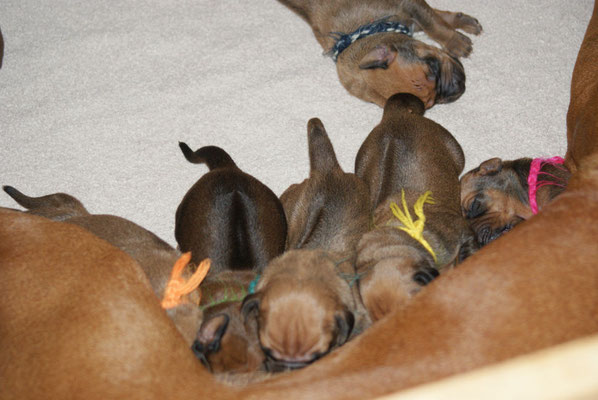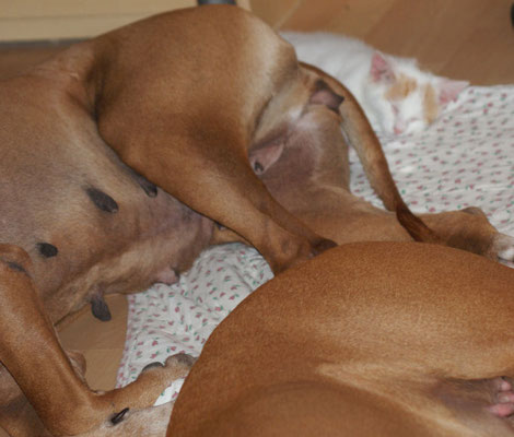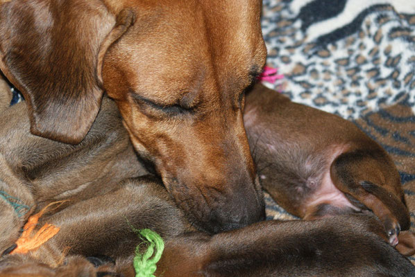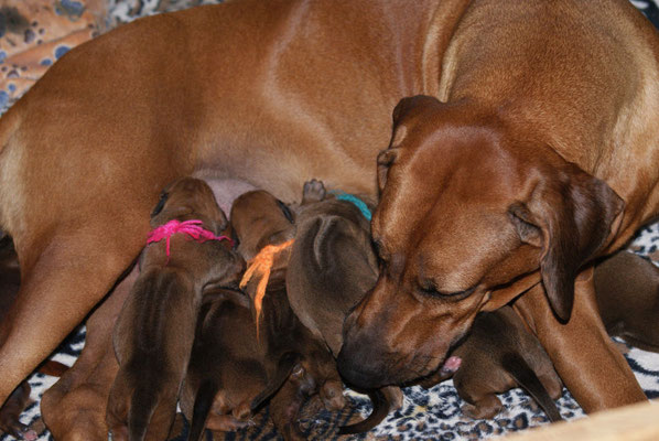Unsere E-leins haben ihre Kilo Marke schon mehr als geknackt, sie sind pausenlos an Chameena's Milchbar angedockt... Chameena ist eine wundervolle Mama, sehr fürsorglich, Ur-Oma Tosha darf im gleichen Raum schlafen....