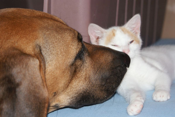 Unserer Neuzugang... der kleine Kater Calimero....der kleine Kämpfer, der mein Herz so berührt hat, ist von unseren Hunden sofort angenommen worden ( ach was bin ich stolz auf sie), am liebsten schläft er bei der besten Ziehmama, und Übermutter Asha, Asha nimmt alles an, hauptsache es ist ein Baby :-D